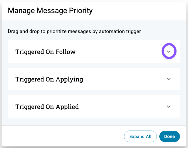 - Go to Engage > Messaging and select the Automated tab. Then, click Manage Priority.