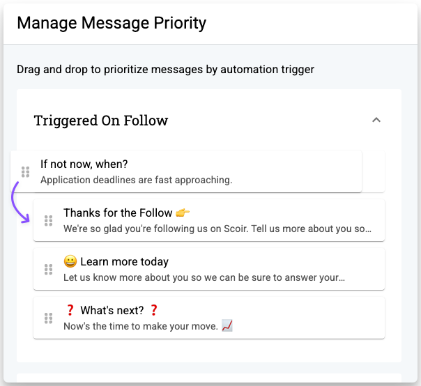 Example: If you have two Following messages (one for Nursing majors and one for the Class of 2026), a student who matches both will only get the one ranked higher in your priority list.