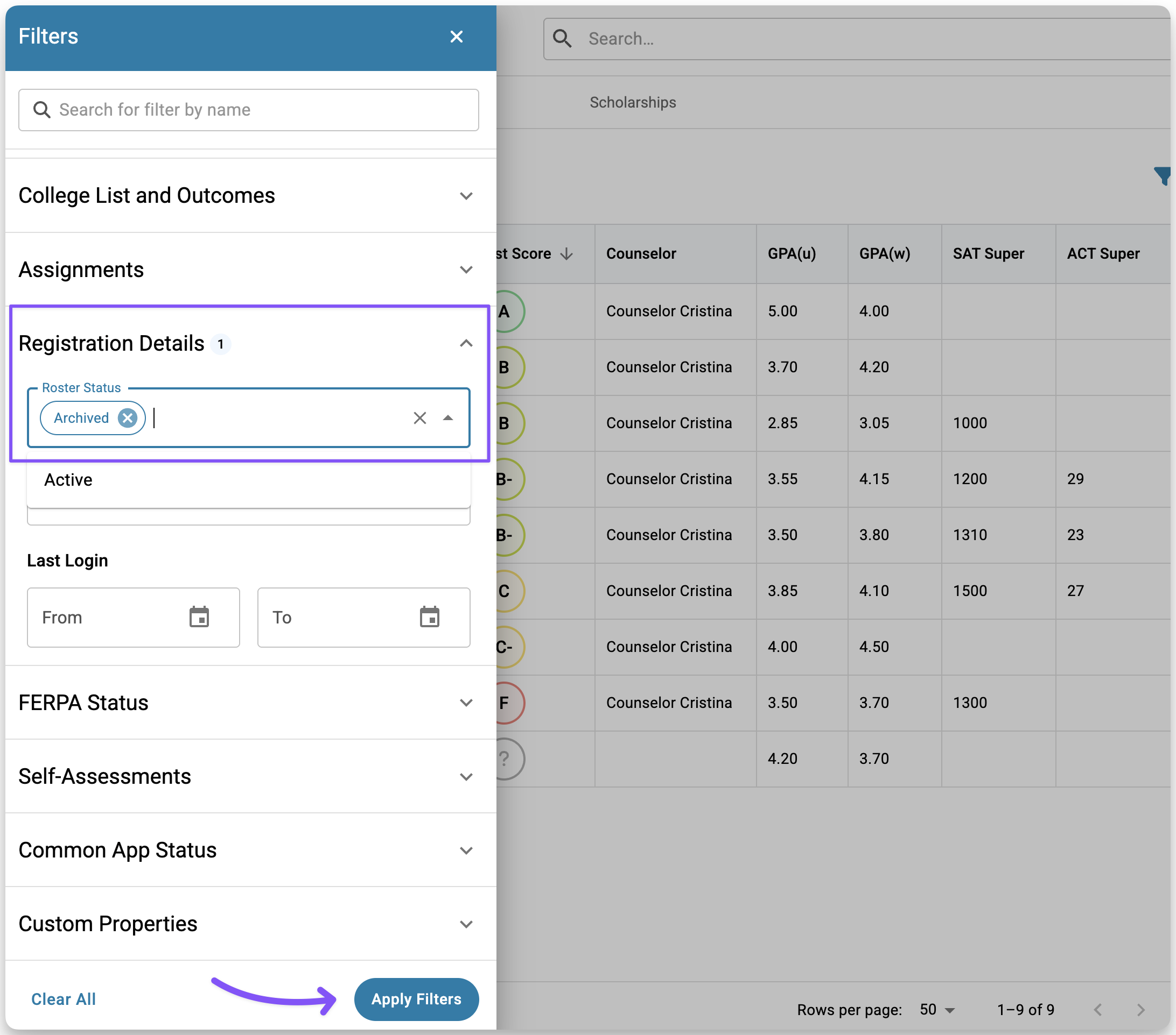 - In the Registration Details section, set Roster Status to Archived and click Apply Filters.