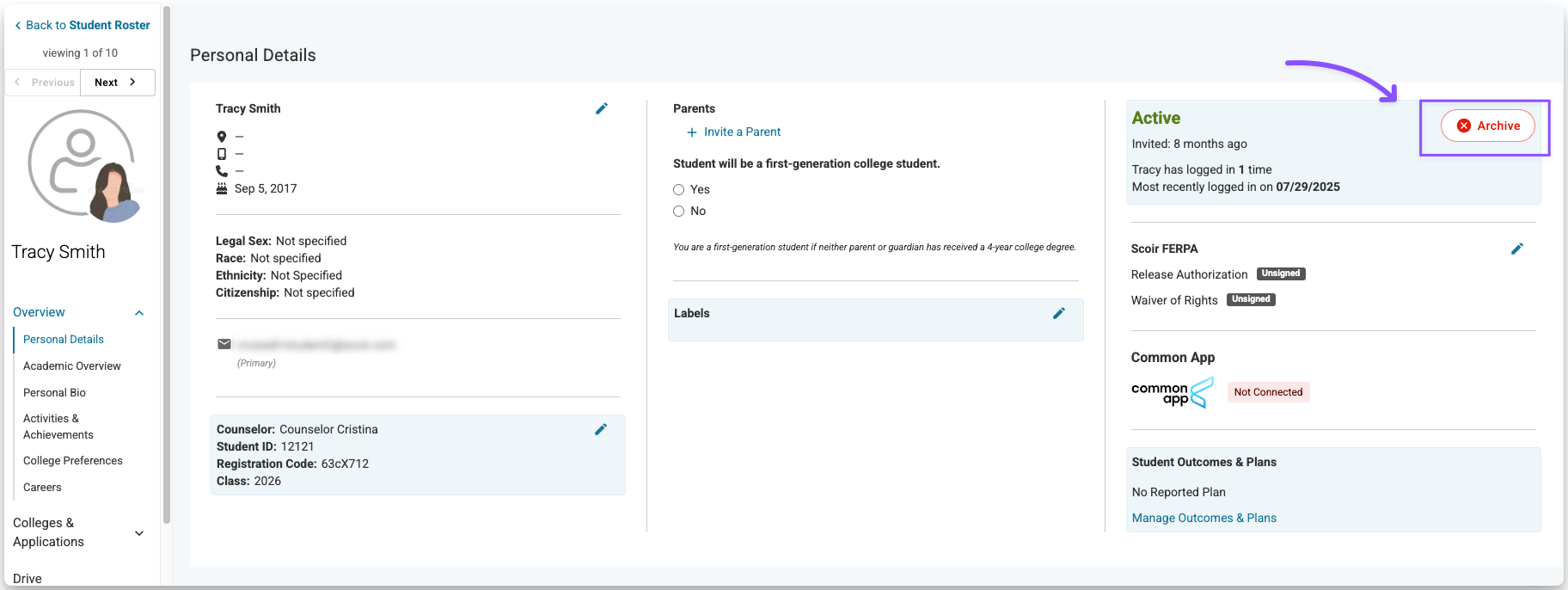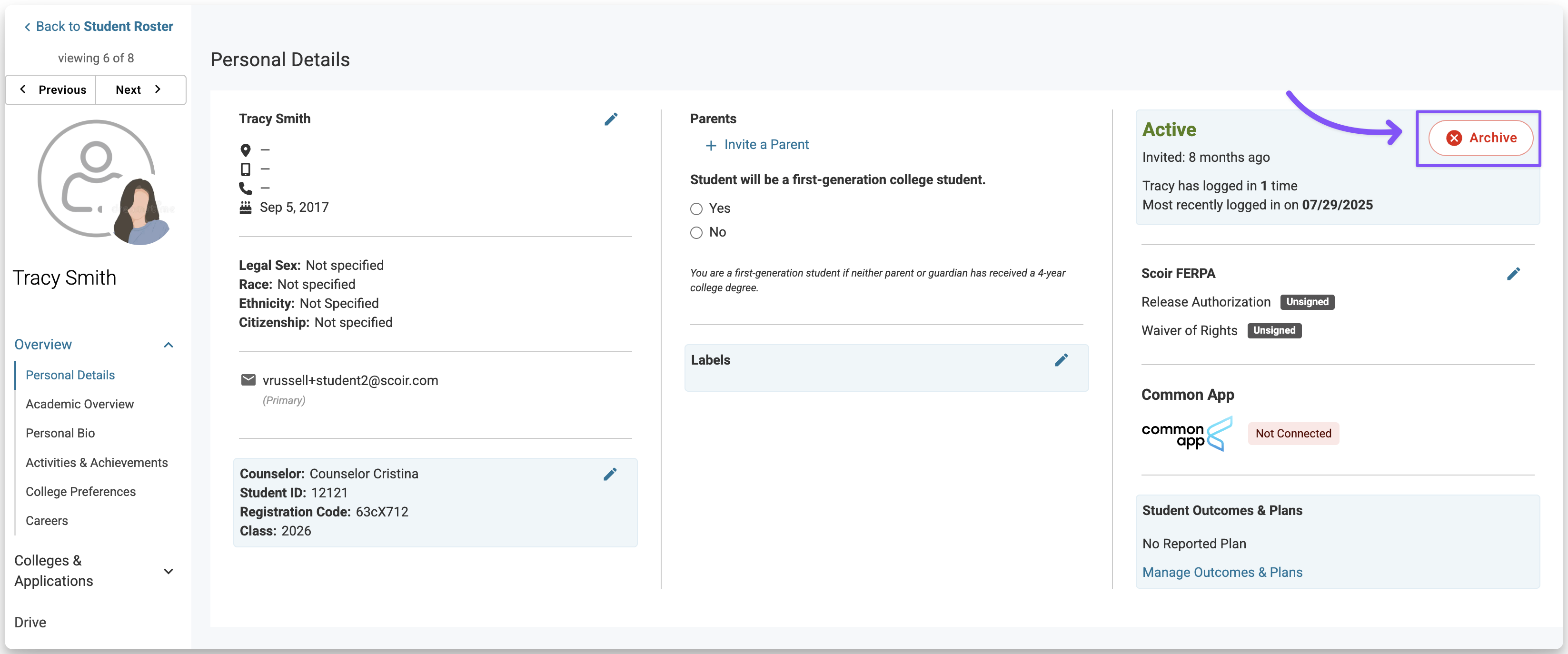 - From the student's profile, click Archive in the top-right corner and confirm.