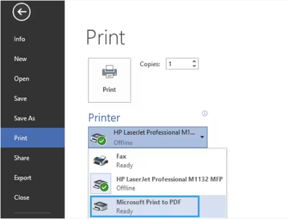 - Click on the drop-down menu under Printer and from the options presented select Microsoft Print to PDF.
