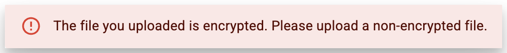 To upload the file successfully, the encryption needs to be removed or you’ll need to save a new, unencrypted version. Here are some options you can try: