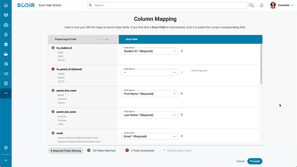 - Review how the fields from your import file are matched to Scoir fields. Make sure each column is mapped correctly so the data syncs as expected, and update any mappings if needed. When you’re ready, click Proceed.