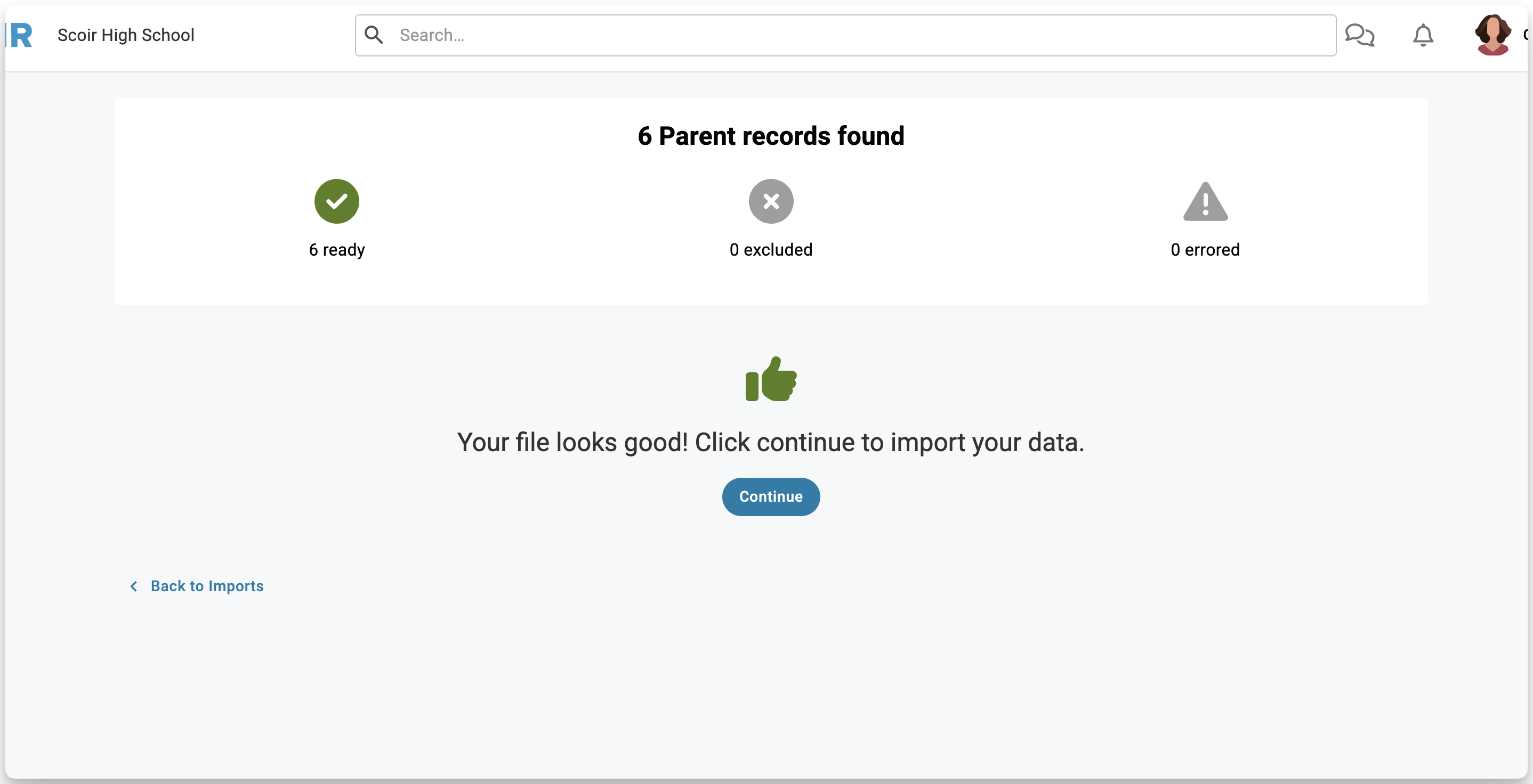 - After clicking Proceed, Scoir reviews your file and confirms whether your data is ready to import. If all records are ready, click Continue to finish.