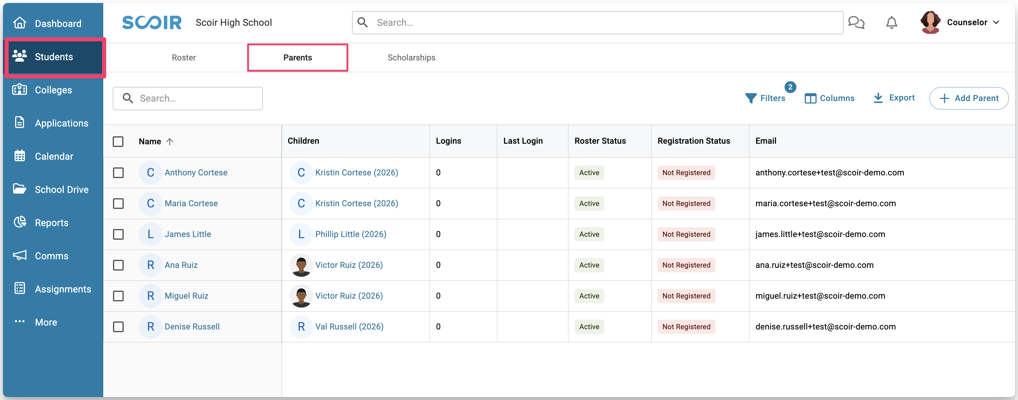 - Once the import is complete, you can find the imported parents in the Parents tab under Students in Scoir.