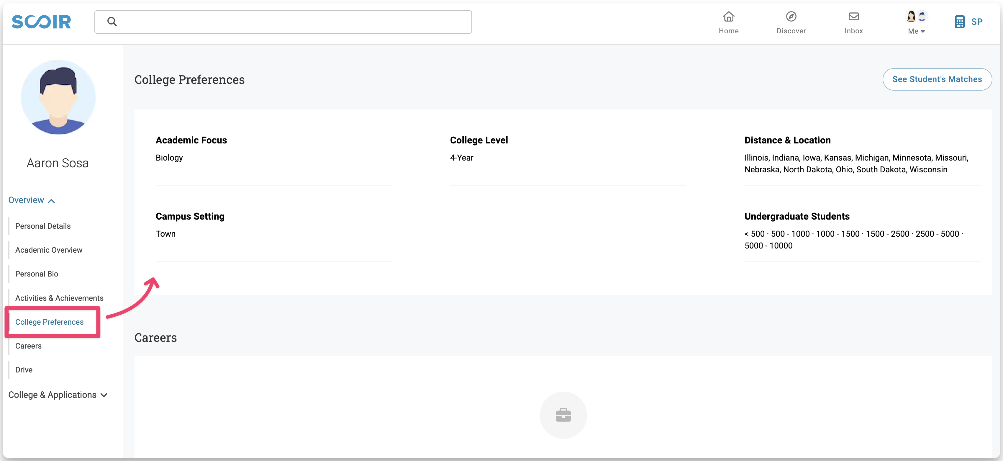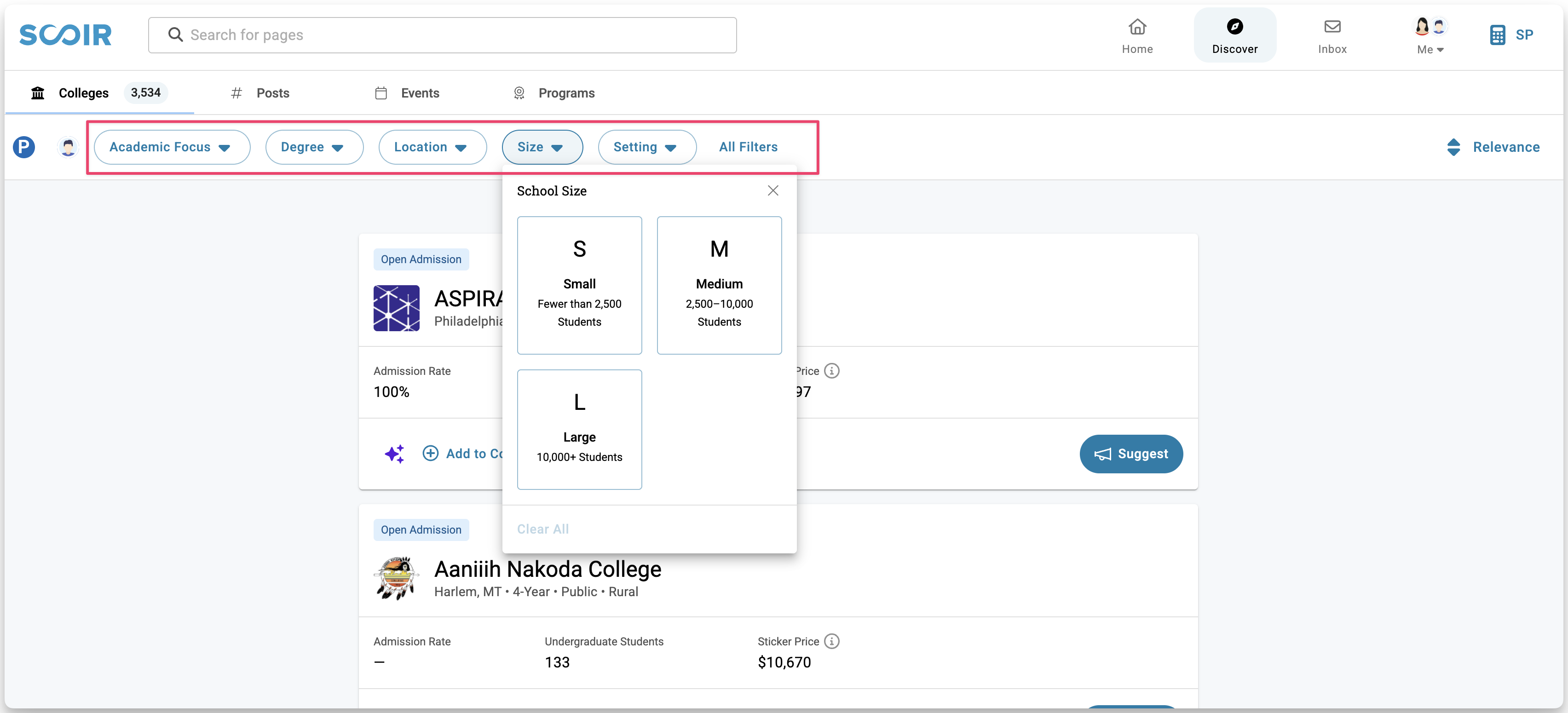 Scoir’s Discover feature allows you to search for colleges within the context of your student.