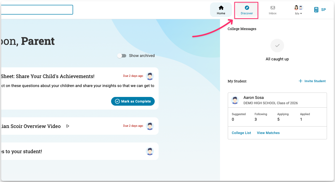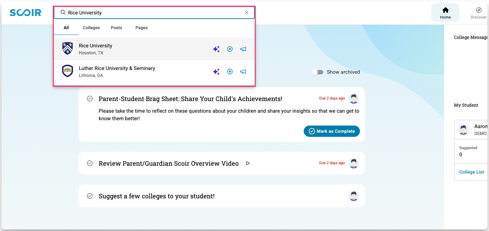 Parents and guardians can use Scoir’s Discover tools to explore colleges, learn more about what they offer, and suggest schools to your student.