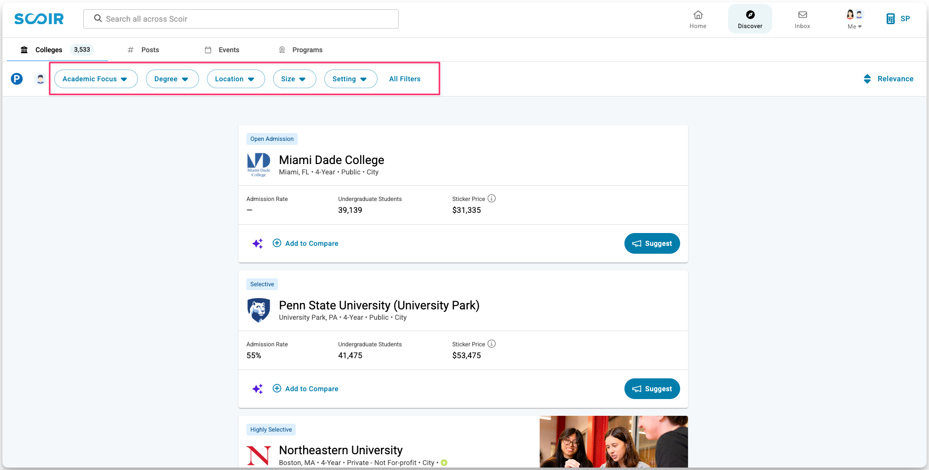 If you’d rather explore more broadly, head to Discover, where you can browse colleges and use filters to narrow down your options.