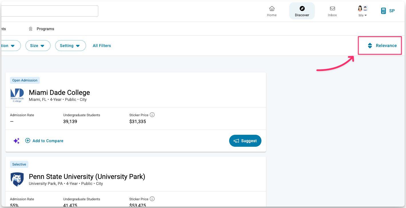 Relevance ranks colleges based on student interest. Colleges with the most interest appear higher in your results. Interest means students who marked a college as following, applying, or applied in Scoir.