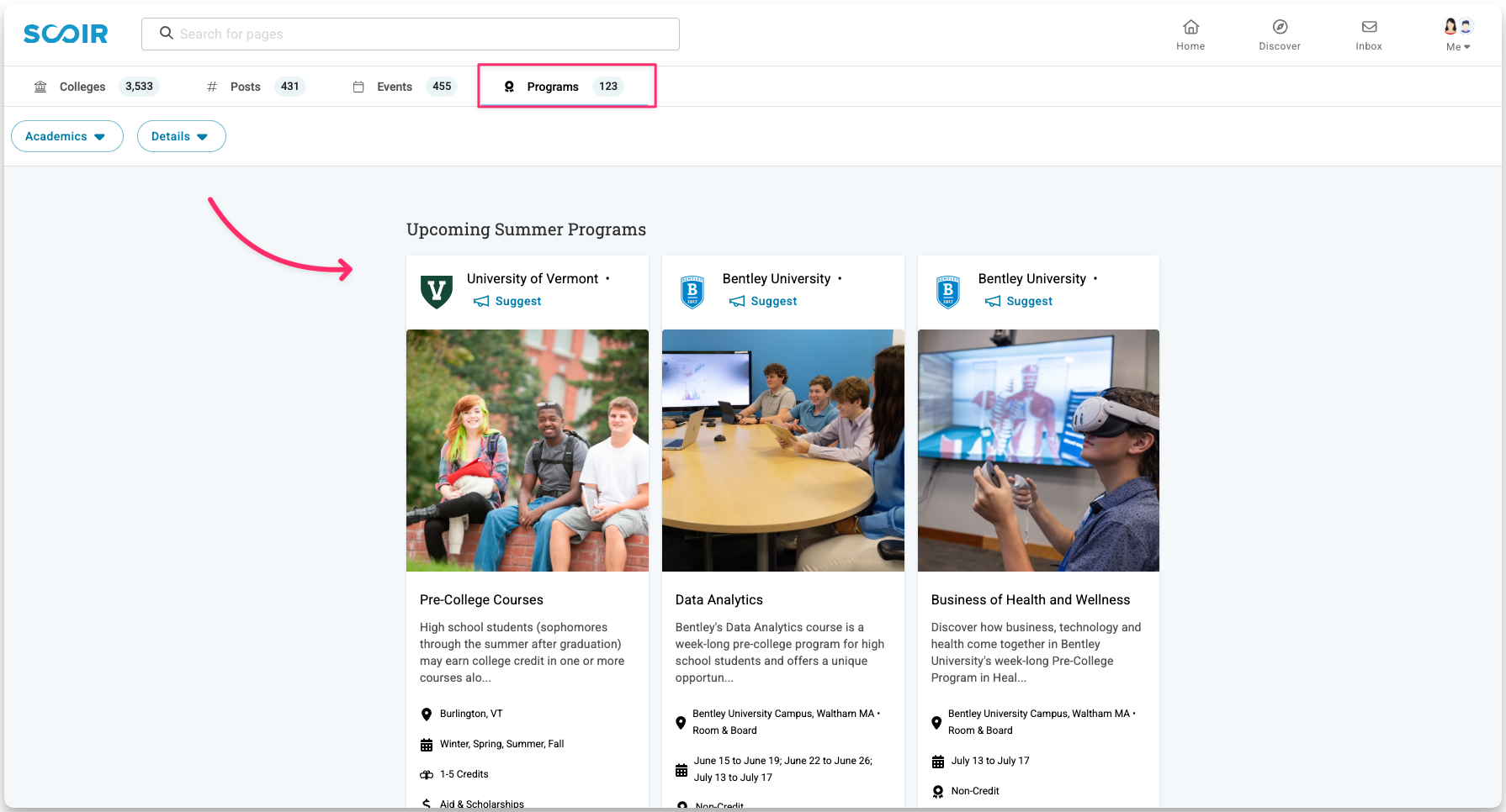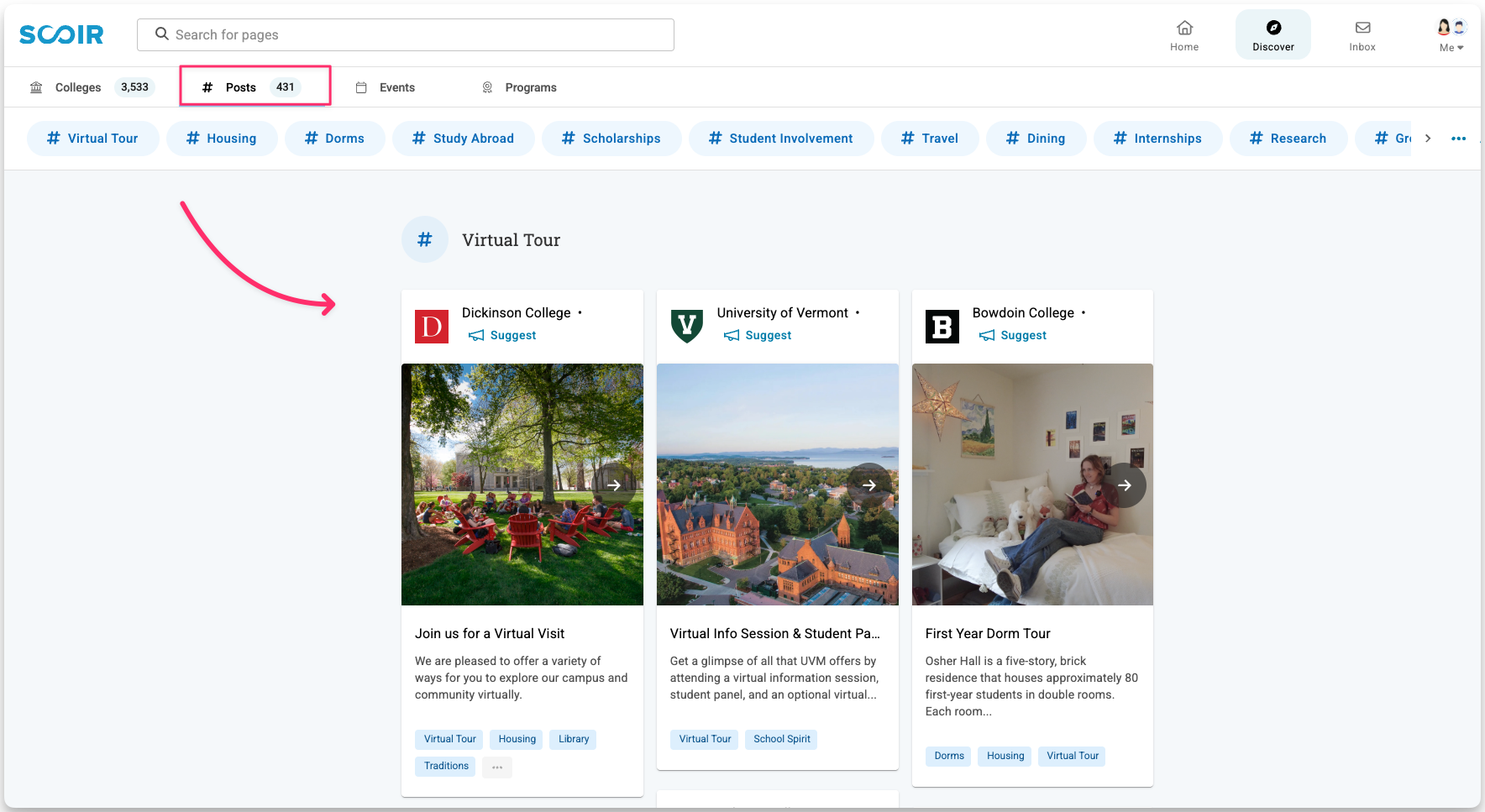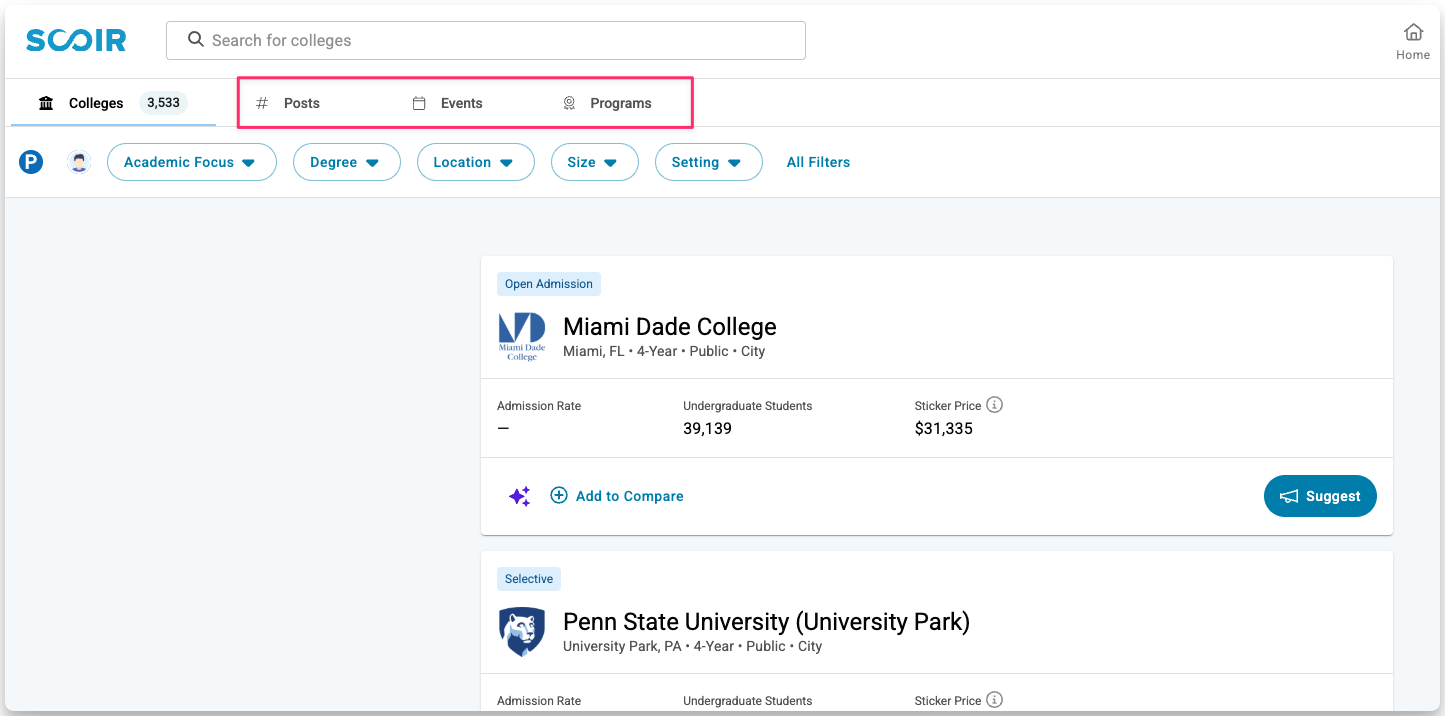 Discovering Colleges Through Posts, Events, and Programs