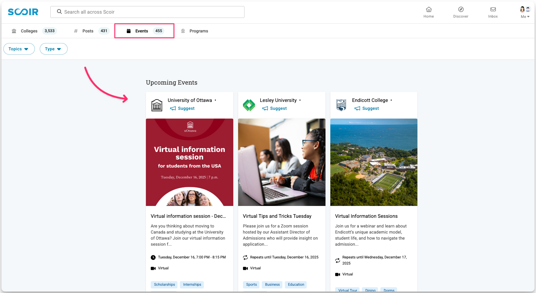 Any notifications about the events will be sent directly from the college, not from within Scoir.