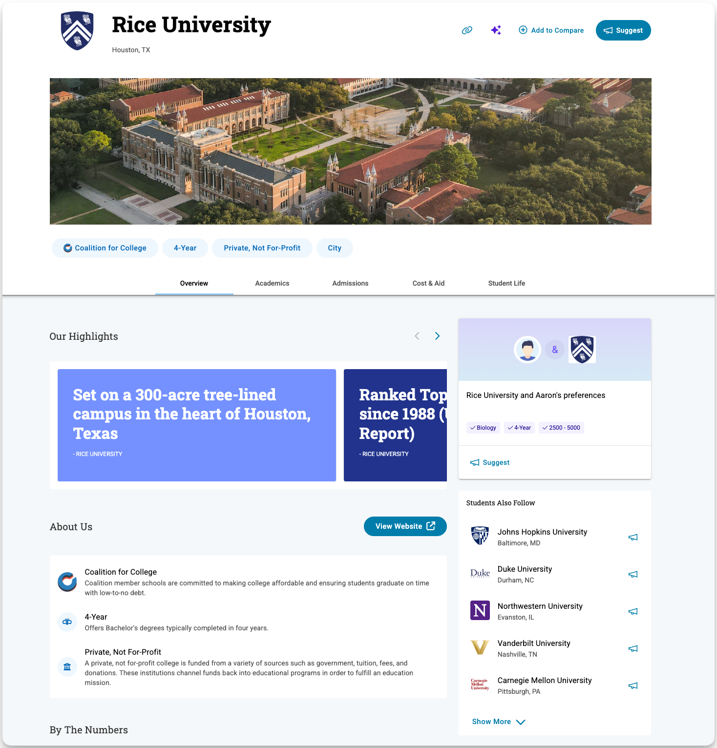 - Cost & Aid provides estimated tuition, fees, net price information, and financial aid data.