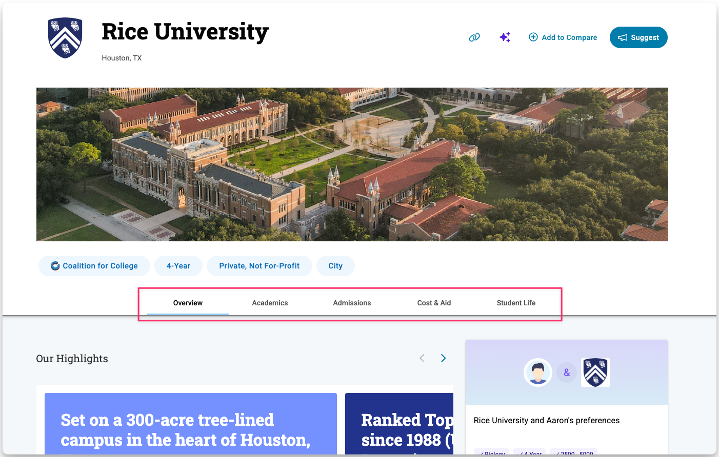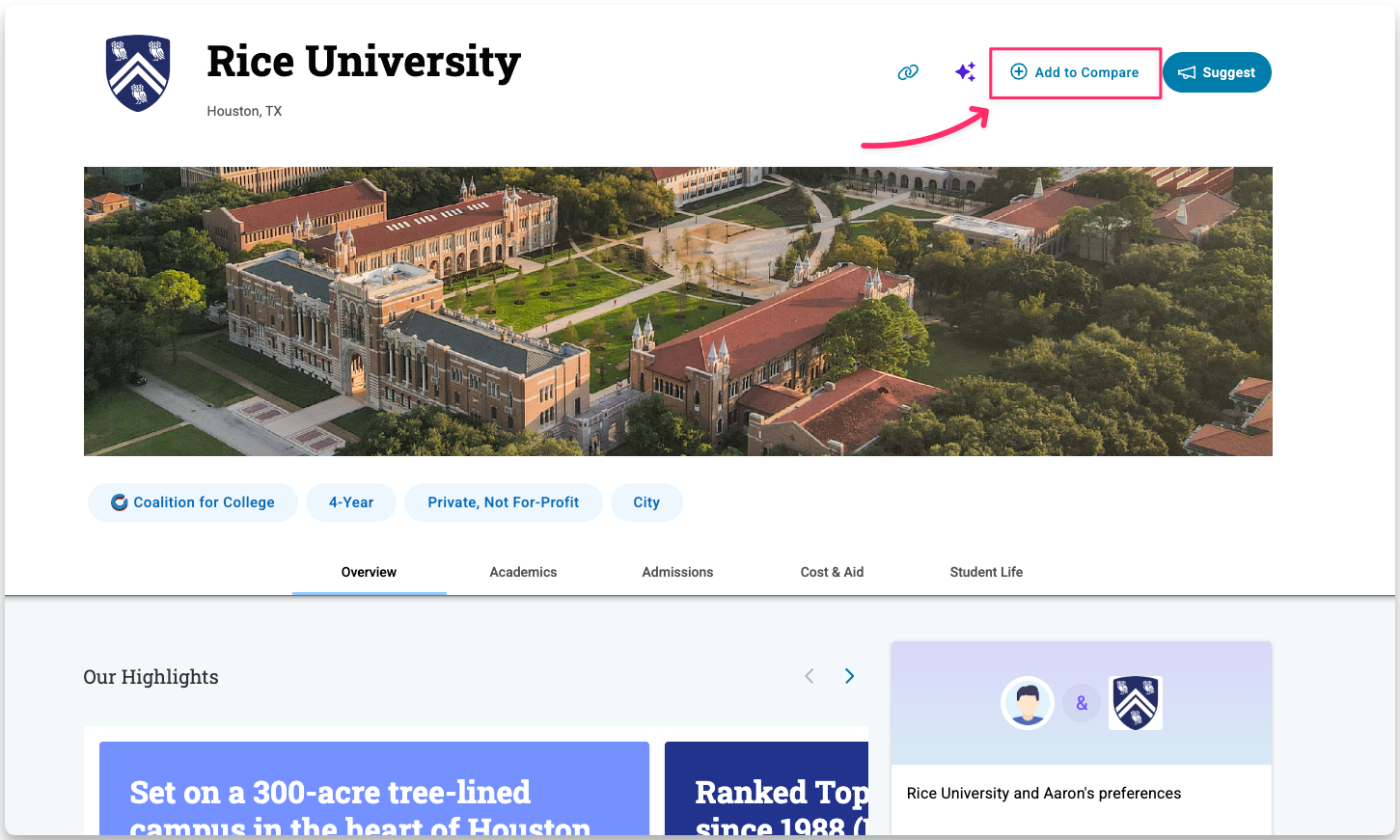 You can add a college to Compare directly from the college profile when you’re viewing a school in more detail.