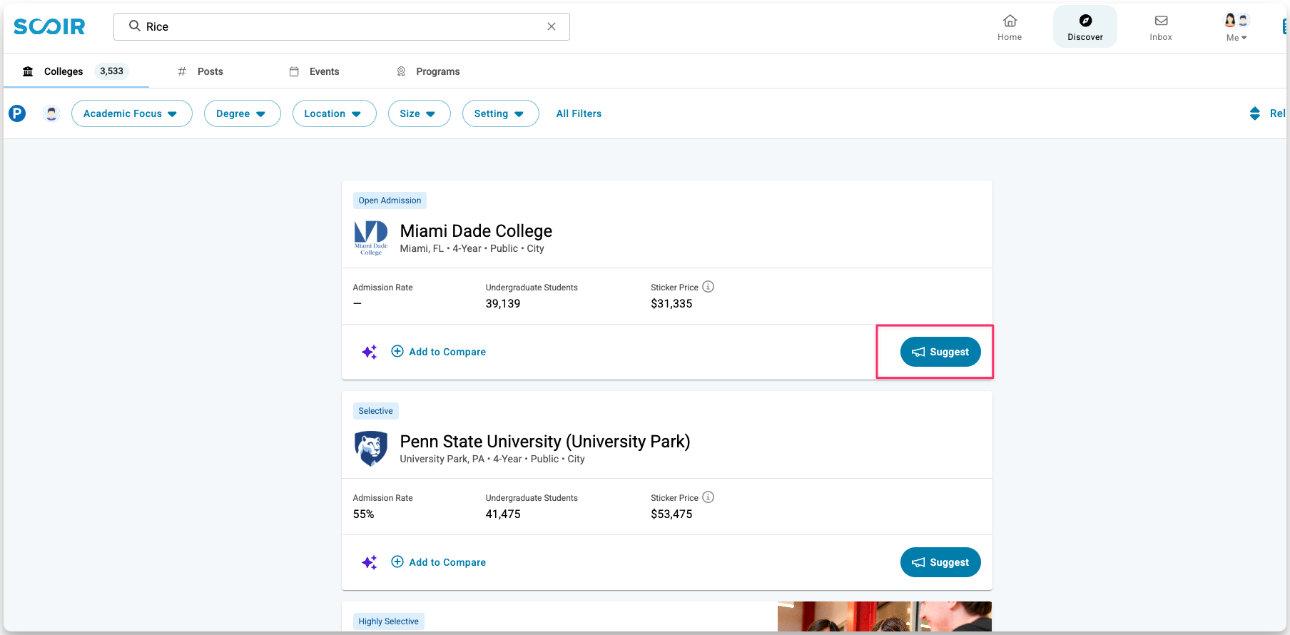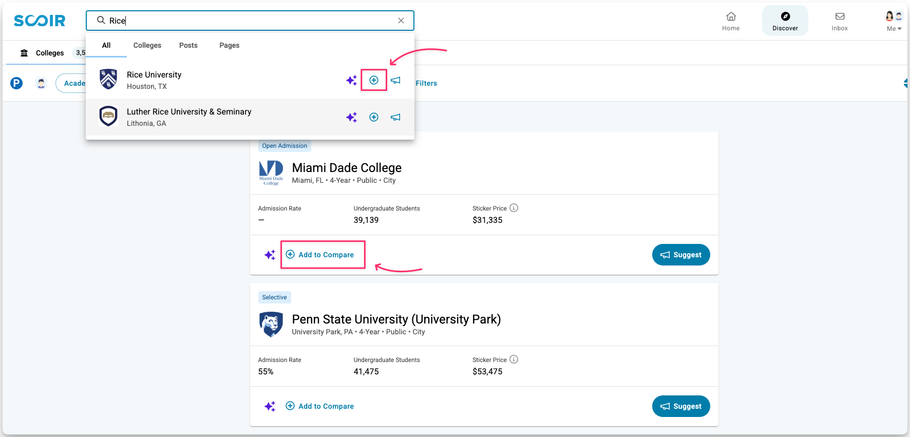 As you explore Scoir, you’ll see opportunities to suggest colleges in multiple places, such as from Discover results or directly from a college profile.