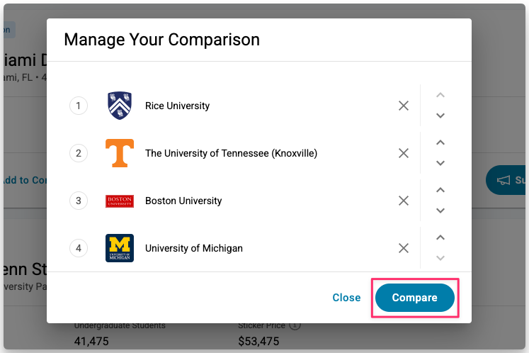 From there, you can remove schools, reorder them, and click Compare to view the full side-by-side breakdown of up to four colleges.