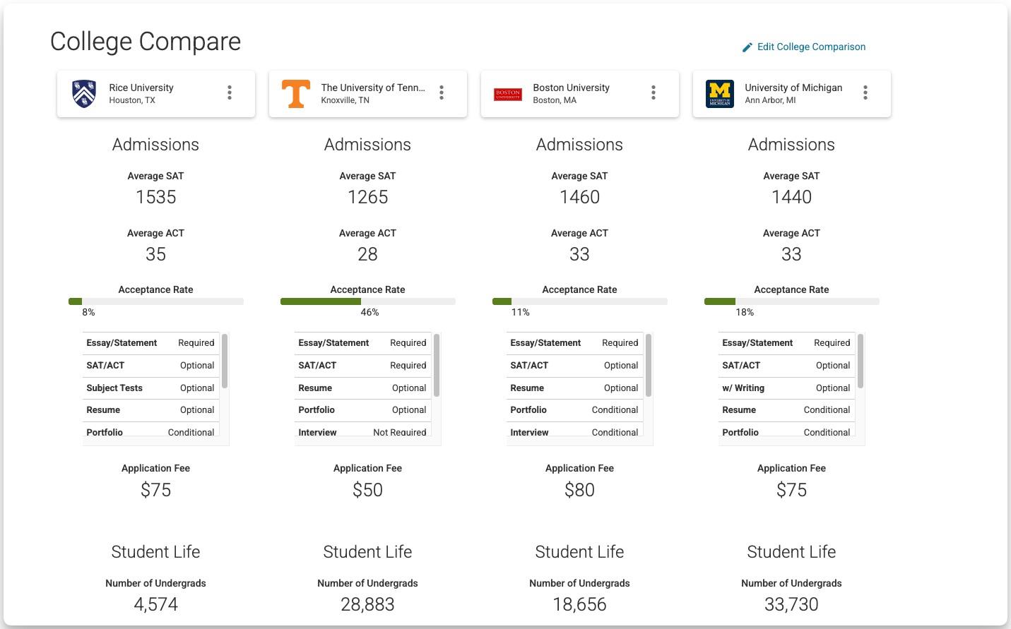 The comparison view lets you see key details—academics, admissions, costs, and more—side by side, making it easier to evaluate options.