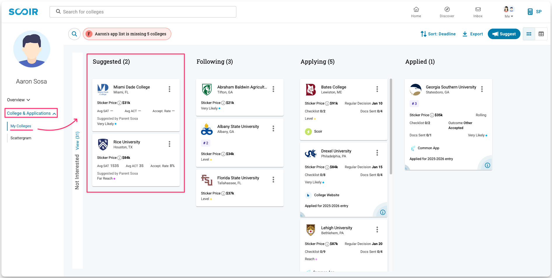 Suggested colleges appear in the Suggested column of your student’s My Colleges page. Your student can move a suggested college into Following or Applying when they’re ready.