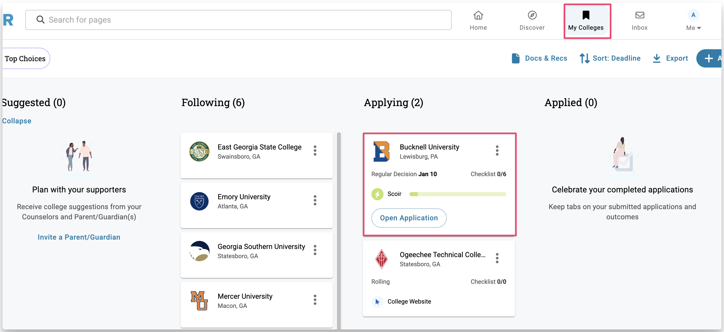 - Go to your My Colleges page in Scoir and click on the tile of the college you’d like the recommendation to be sent to.