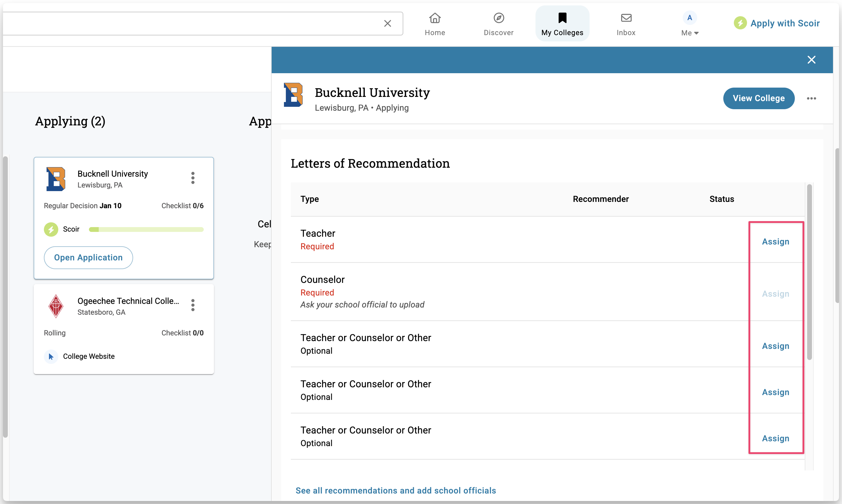 - In the panel that appears, scroll to the “Letters of Recommendation” section. If you see an "Assign" button, that means the letter hasn't been sent to that college yet. Click Assign to assign the recommendation to an open slot.